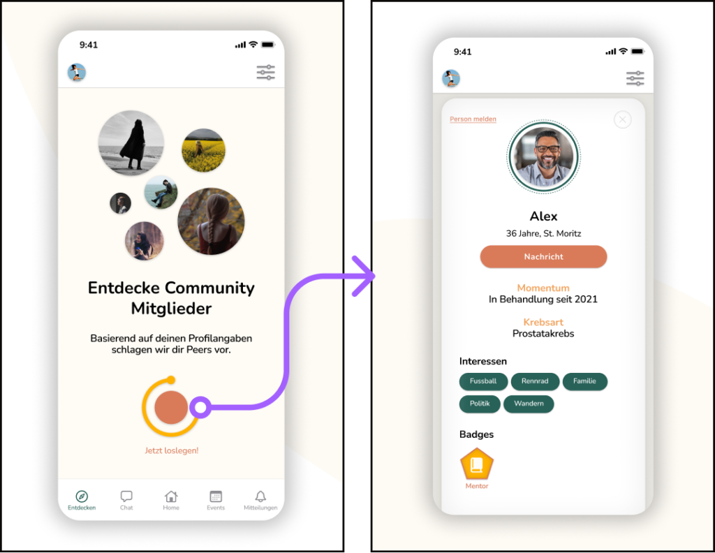 Figure 3: User feedback revealed that connecting with unknown peers posed a challenge. Through benchmark analysis, I investigated how other online services connect strangers. Drawing inspiration from dating and community apps, I adopted a similar approach and developed a solution enabling users to explore individuals via a feature that shows peers similar to a user’s own interests, activities, age, cancer type, patient group etc.