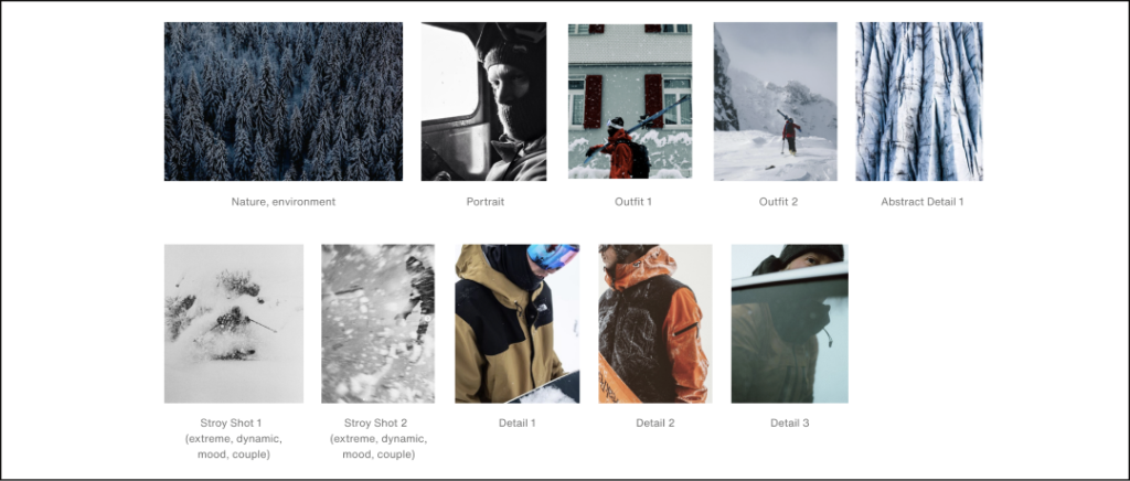 Figure 2: Storyboard for outdoor production. Commercial Campaign Skiing Winter 2022.